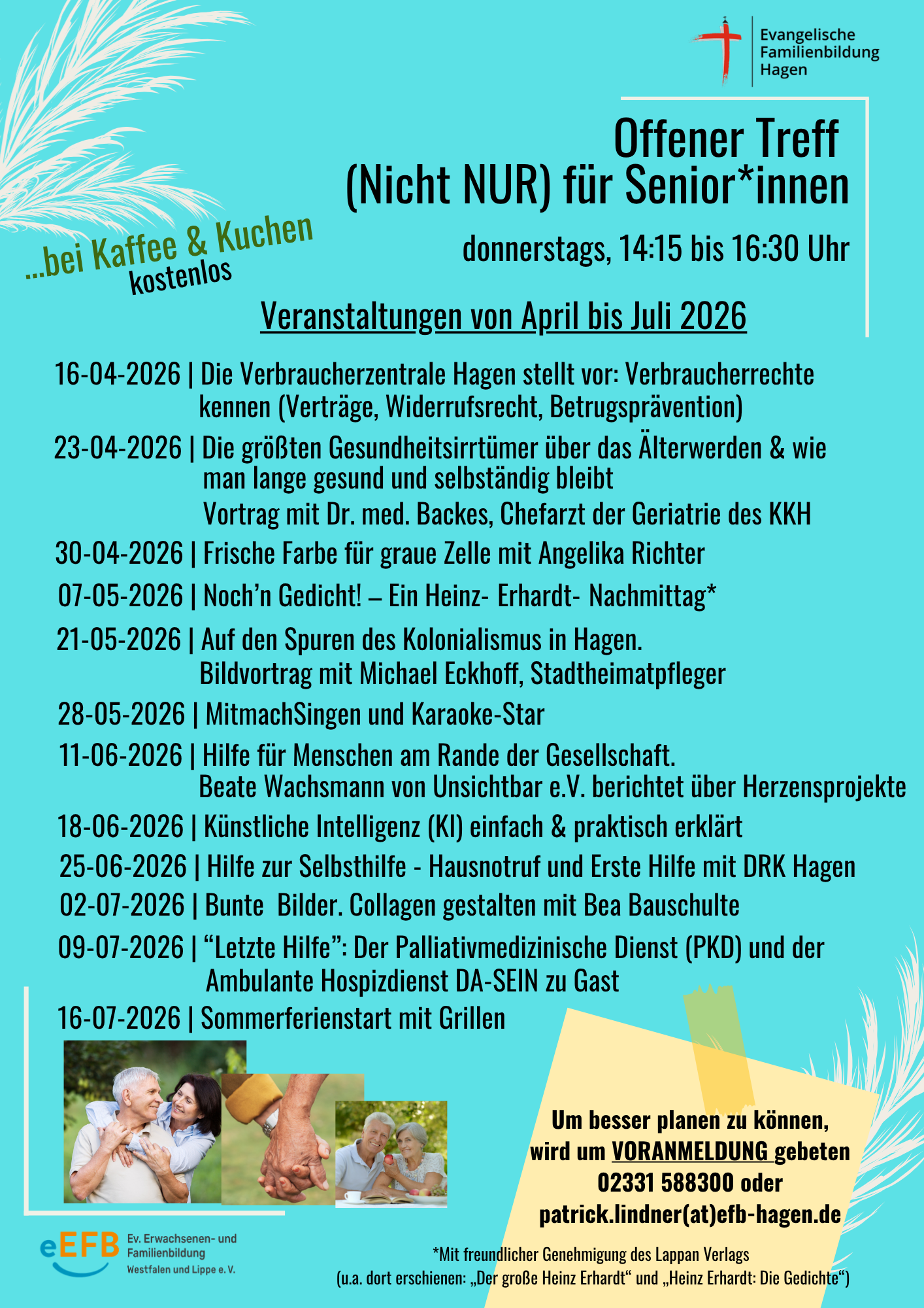 Kostenlos, unterhaltsam, informativ…. bei Kaffee und Kuchen NEUER TERMINE für 2026 (s. Link unten) Qigong ist eine Kombination aus harmonischen Bewegungsabläufen, Atmung und Meditation / Konzentration. Durch… Info & Anmeldung: Siehe in unseren Angeboten „Aktiv für Gesundheit“ Das neue Programm des Offenen Treffs (NICHT nur) für Seniorinnen und Senioren